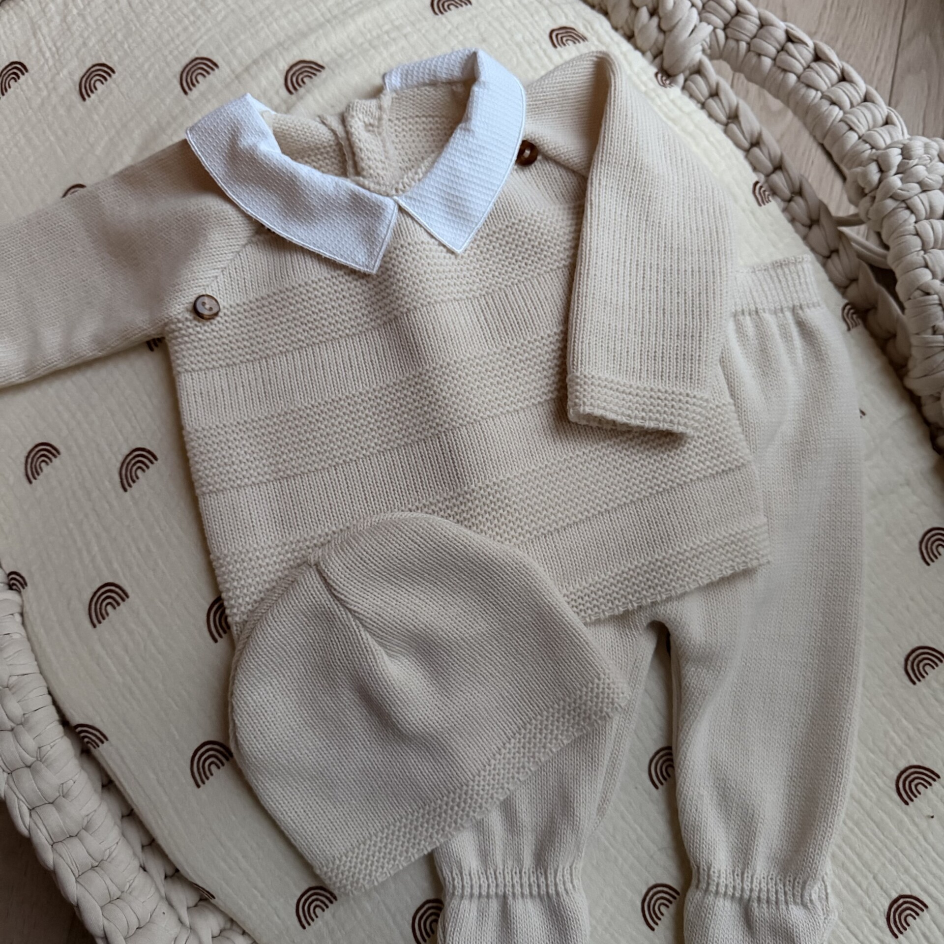 En tricot finement travaillé, il fera un parfait cadeau de naissance avec son joli bonnet assorti.