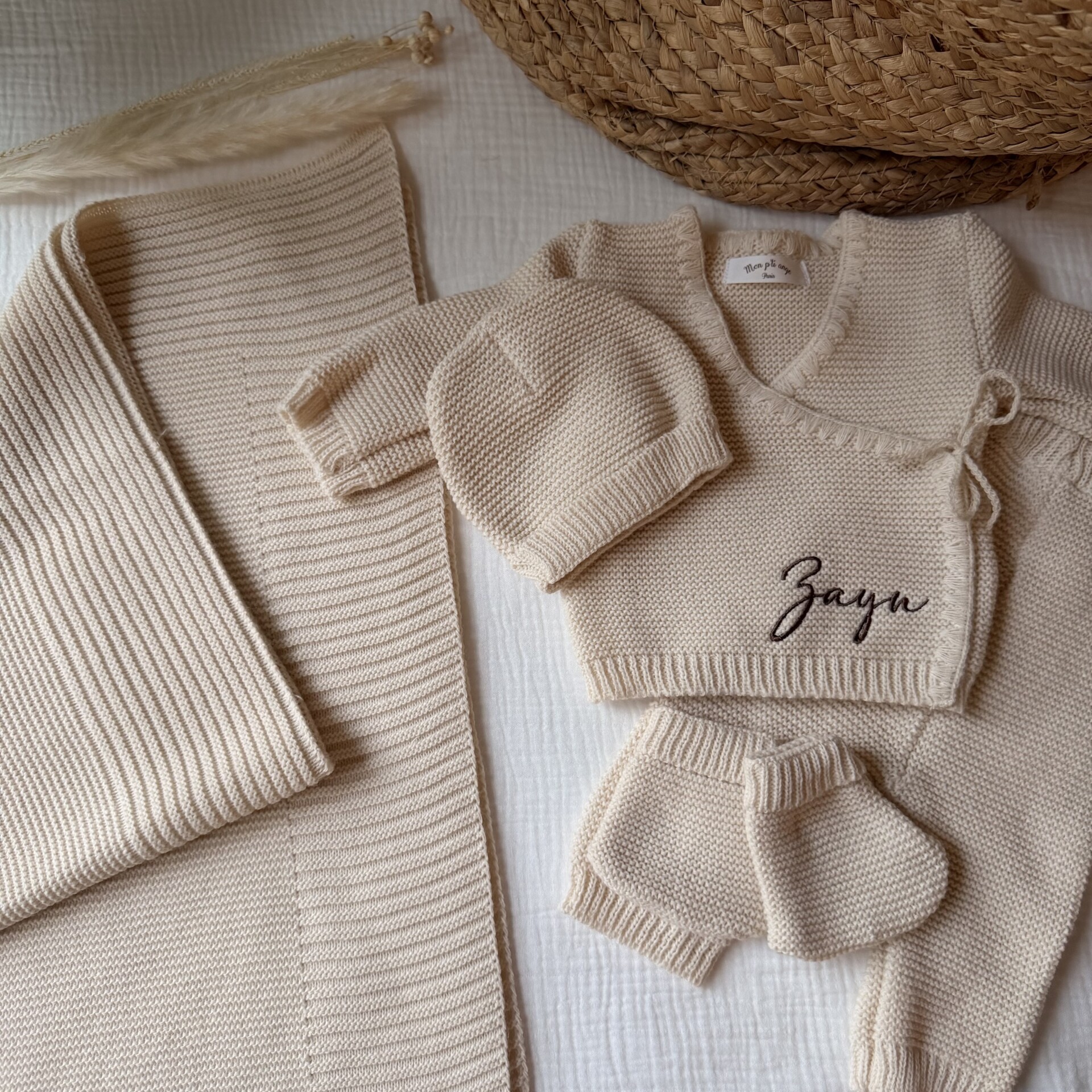Une tenue en maille 4 pièces assortie : brassière, pantalon, bonnet, moufles et chaussons, pour un ensemble harmonieux et plein de charme.